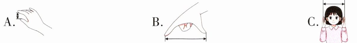 (1)下面的手势,( )能表示1分米的长度。