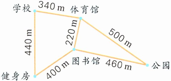 成成从图书馆经过体育馆和学校,到达健身房的距离刚好是1千米。