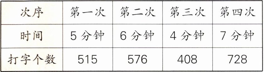 3. 为了参加社区举办的打字比赛,王阿姨每天都在电脑上练习打字。下面是她最近四次的打字练习记录。打字最快的是第几次?最慢的呢?