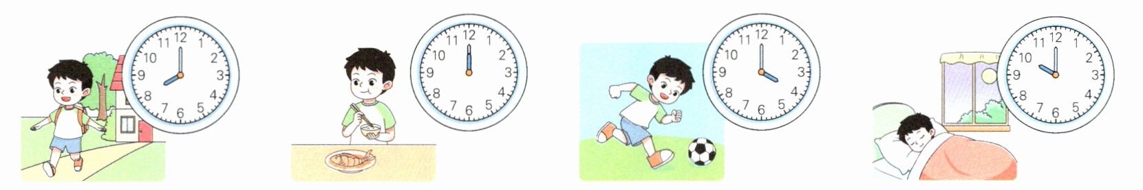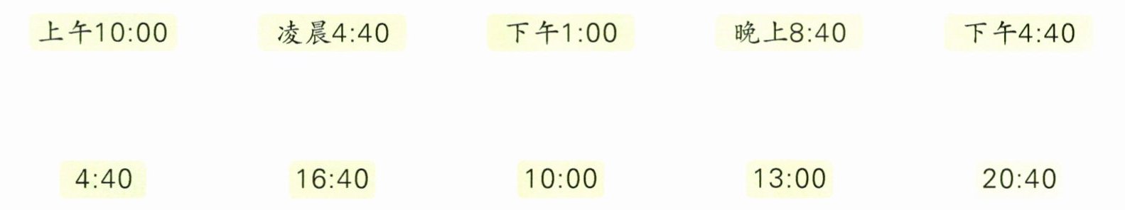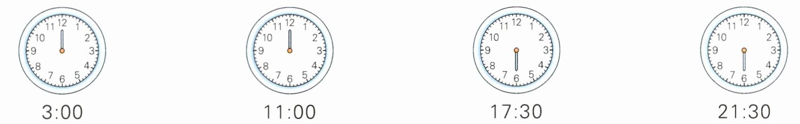 3. 根据图意,用24时记时法表示下面钟面上的时间。
