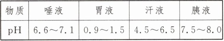 材料二:人体内的一些无色液体或排泄物的正常$pH$范围如下: