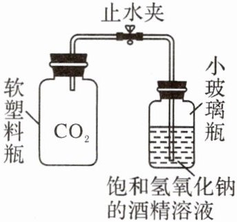 9. (2025·兴义模拟)已知20℃时,氢氧化钠易溶于酒精,碳酸钠在酒精中几乎不溶解。20℃时,某同学利用如图所示微型实验验证$CO_2$能与NaOH发生反应。打开止水夹,轻轻挤压软塑料瓶,观察实验现象,下列说法不正确的是 (