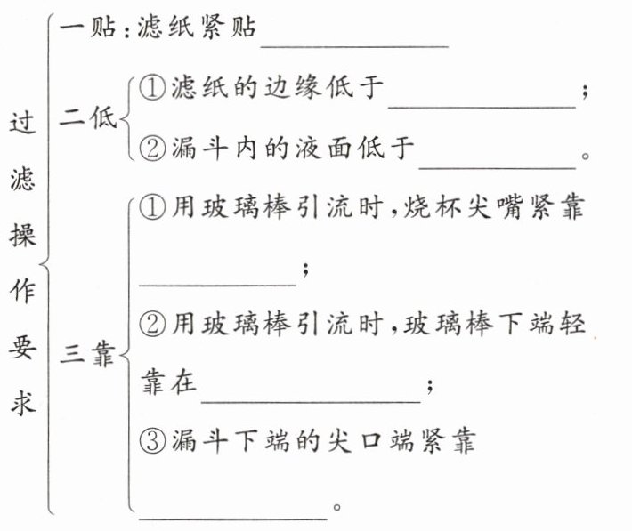 漏斗内壁 漏斗边缘 滤纸的边缘 玻璃棒 三层滤纸上 烧杯内壁