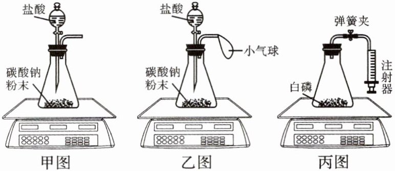 (1)第 1 组设计甲图的实验方案,用电子秤称量,读取加入盐酸前后的质量。反应的化学方程式为$ Na_2CO_3+2HCl= 2NaCl+H_2O+CO_2↑,$比较读数发现反应前后的质量并不相等,其原因是