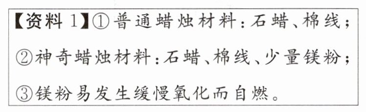 (1)点燃一根“神奇”蜡烛,吹灭火焰后会自动复燃。原因是烛心的镁粉继续氧化放热,重新引燃蜡烛。熄灭该神奇蜡烛的合理操作是