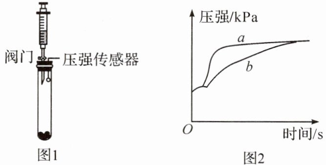 10. (新中考·学科融合)小华想探究化学反应速率的影响因素。选择块状和粉末状的同种石灰石分别与相同浓度等质量的稀盐酸在密闭容器中反应(如图 1),利用传感器测定其压强变化(如图 2)。