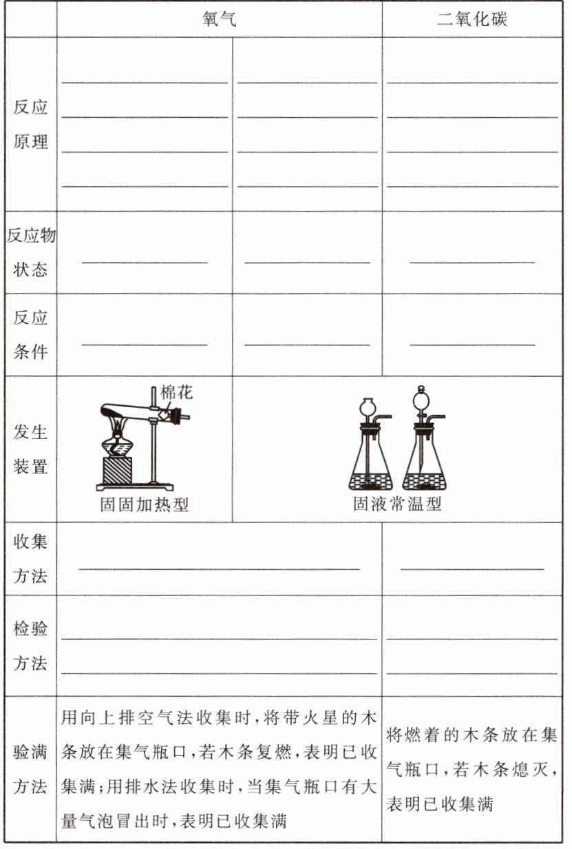 反应原理:$2{KMnO_4}\xlongequal{\triangle}{K_2MnO_4}+{MnO_2}+{O_2}\uparrow$、$2{KClO_3}\xlongequal[\triangle]{{MnO_2}}2{KCl}+3{O_2}\uparrow$、$2{H_2O_2}\xlongequal{{MnO_2}}2{H_2O}+{O_2}\uparrow$;${CaCO_3}+2{HCl}\xlongequal{}{CaCl_2}+{CO_2}\uparrow+{H_2O}$ 反应物状态:固体(或固体与固体)、固体与液体;固体与液体 反应条件:加热、常温、催化剂;常温 收集方法:排水法、向上排空气法;向上排空气法 检验方法:将带火星的木条伸入集气瓶内,若木条复燃,证明是氧气;通入澄清石灰水中,若澄清石灰水变浑浊,证明是二氧化碳