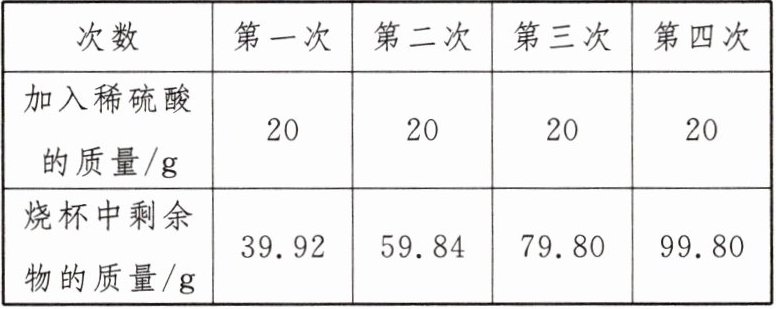(2)解:分析数据可知,第一次加入20g稀硫酸与锌完全反应后生成氢气的质量为:20g+20g-39.92g=0.08g。