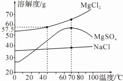 9. (2024·临州)青盐是以盐湖卤水为原料在盐田中晒制而成的盐。盐中除NaCl外,还含有$MgCl_2、$$MgSO_4$等,三种物质的溶解度曲线如图所示。