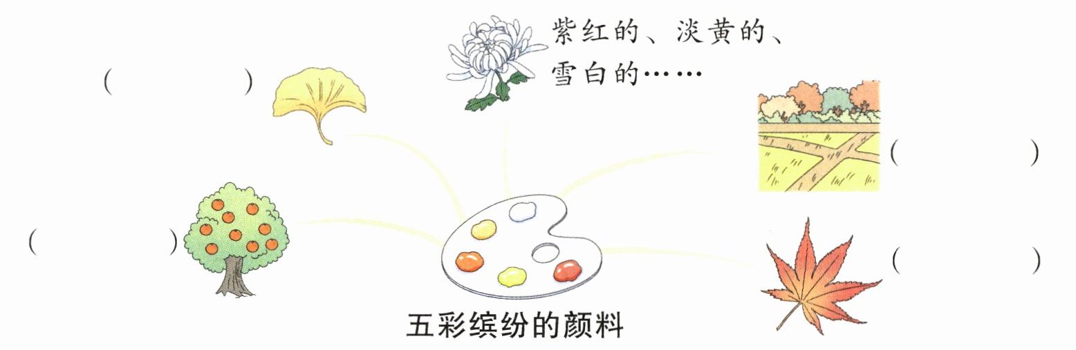 1.(按顺时针排序)橙红色 黄色 金黄色 红色 2.秋天的雨,有一盒五彩缤纷的颜料。 3.人 水果丰收 4.黄黄的叶子像一把把小扇子 红红的枫叶像一枚枚邮票 田野像金色的海洋 示例:紫色 葡萄 紫莹莹的葡萄像一串串透亮的紫珍珠,摇啊摇啊,摇来了阵阵甜香