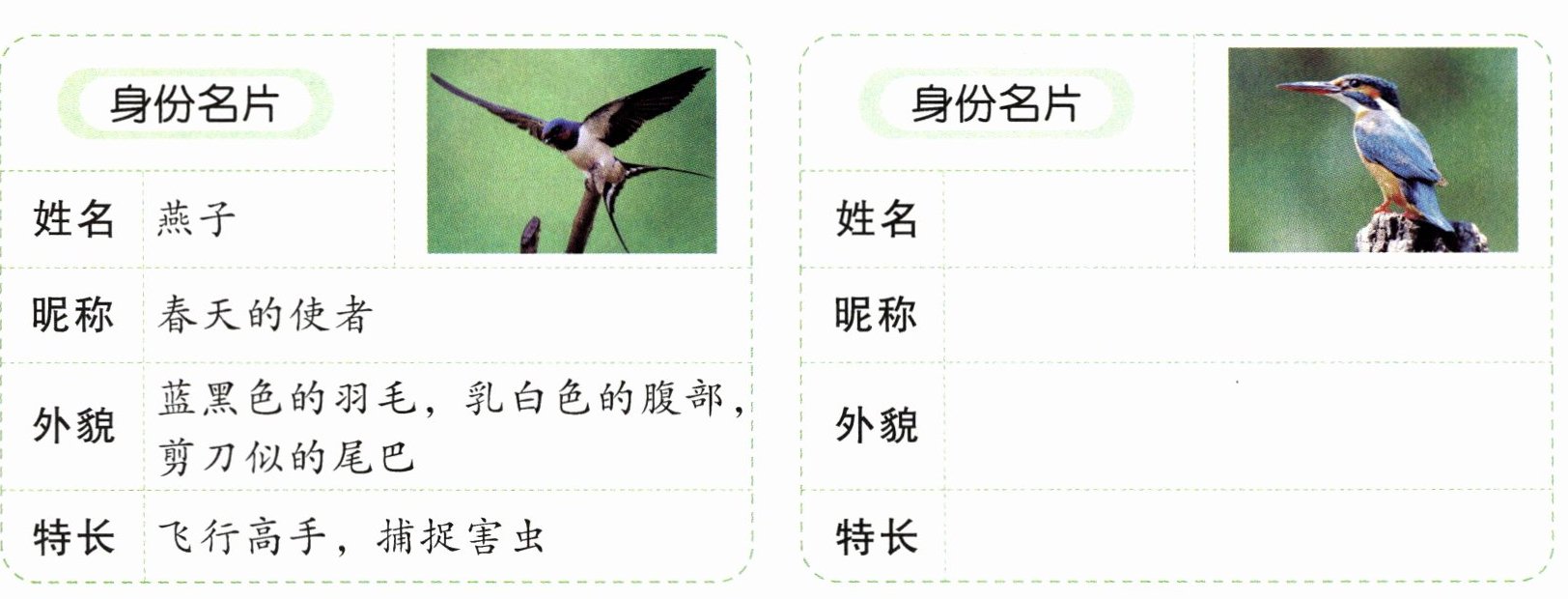 六 新情境 看了燕子的身份名片以后,状状想帮翠鸟也制作一张名片,我们一起来帮他填写名片吧! 考点5