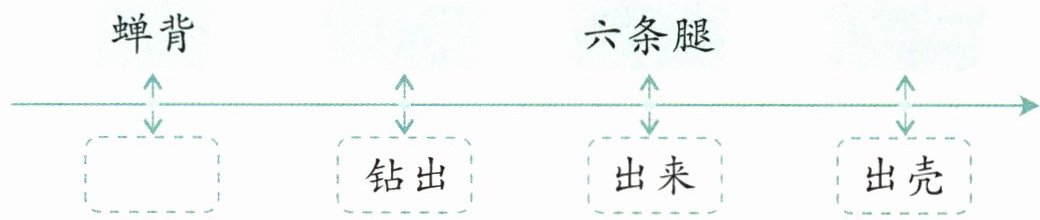 蝉开始脱壳了!它整个身体来回地抽搐(chù)了几下,背上立刻裂开了一道口子,蝉背露出来了。背上那一层保护甲的颜色很快地变化着,先是极淡的绿色,一会儿变成了深绿色。接着,蝉头钻出来了,又黑又亮的眼睛像两颗花椒(jiāo)籽。六条腿出来了,整个身子在慢慢地活动。最有趣的是蝉尾出壳的情景。未出壳的蝉尾使劲地抖动着,已经出壳的上半身向后仰,又敏捷地向前扑来,再用前脚抓住蝉壳用力一抽,又白又嫩的蝉尾就出来了。
