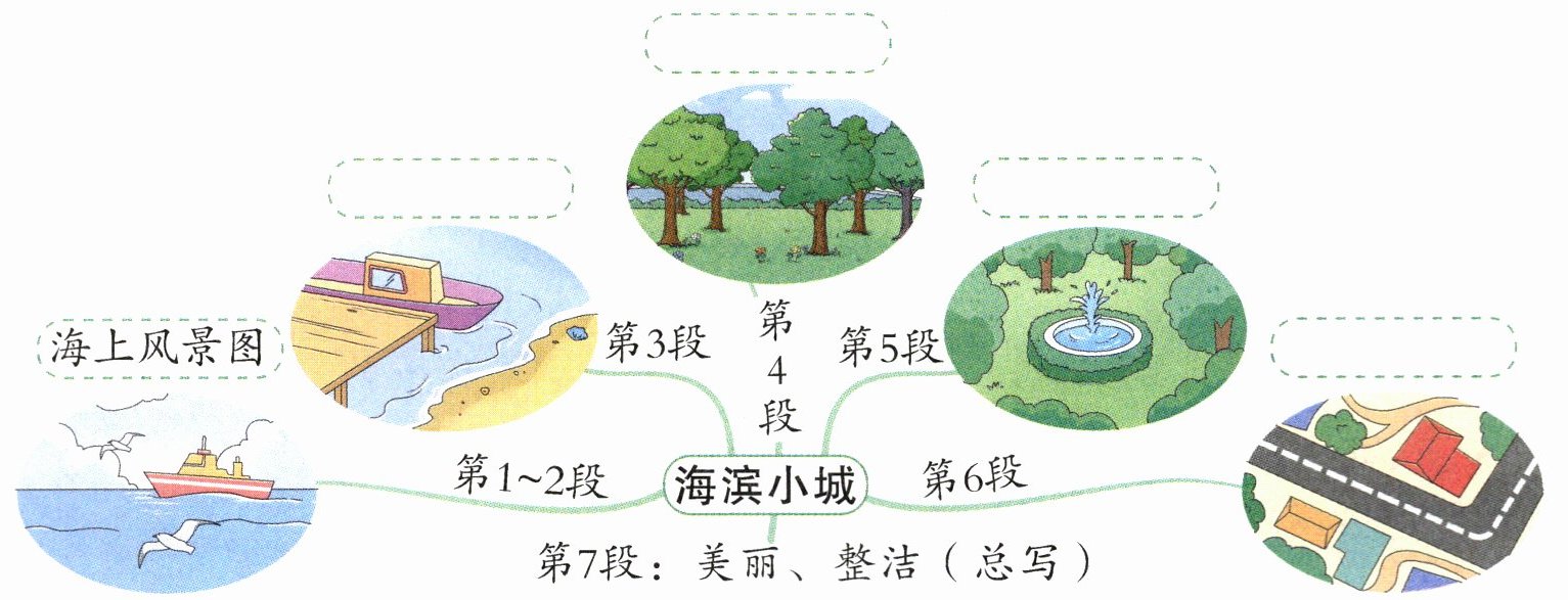新思维 课文介绍了海滨小城的哪些景色?结合图片完成思维导图。考点 5