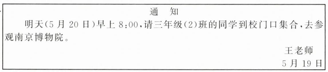 3 王老师准备明天(5月20日)组织三年级(2)班的学生去参观南京博物院,要求大家早上八点在校门口集合,请你帮老师拟一则通知。