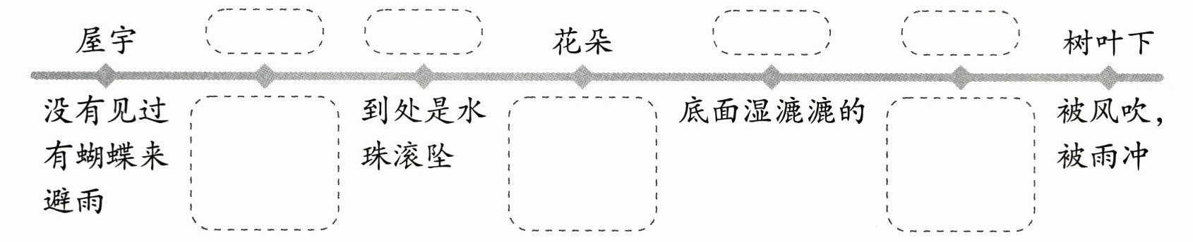 从左到右:麦田 不能避雨 树林 花朵自己都被雨点打得抖个不停 老树干 桥下 没见过蝴蝶落到石头上