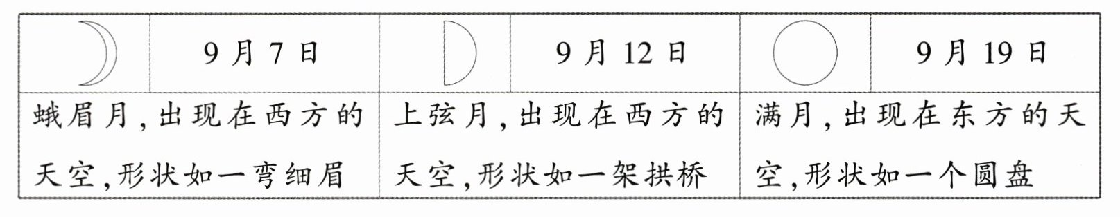 六 (学科融合)下面是截取的元元记录的九月月亮变化表的一部分,请你观察图片和文字完成练习。