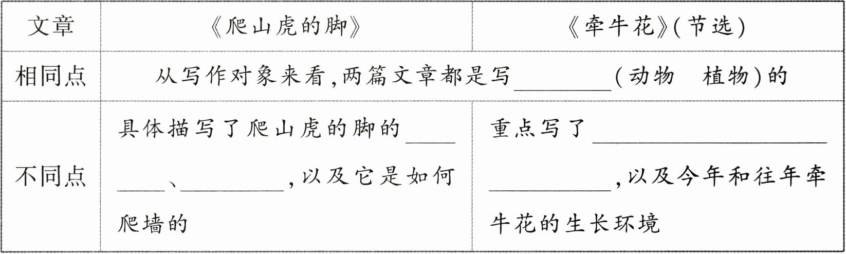 。3. (新角度)对比阅读《爬山虎的脚》和本文,完成下列表格。