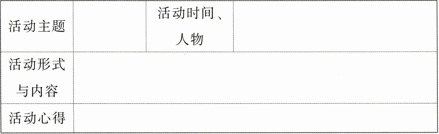 活动主题:走月亮 活动时间、人物:中秋节的晚上,我和爸爸妈妈 活动形式与内容:在中秋月夜,和爸爸妈妈一起沿着公园的小路走月亮,用文字和照片记录与月亮有关的场景 活动心得:和亲人在一起欣赏月夜景色是如此幸福
