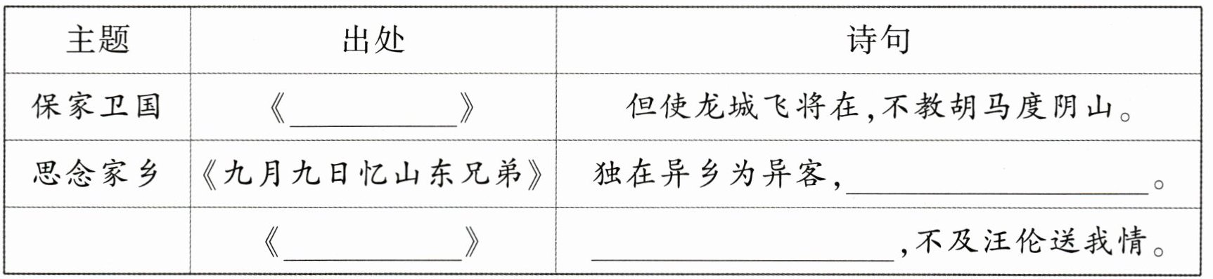 五(新思维)分门别类填古诗。根据提示,补全下列表格。考点5