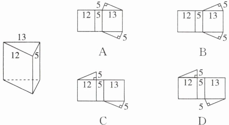 9. 如图是一个直三棱柱,它的底面是边长分别为5,12,13的直角三角形。下列图形中,是该直三棱柱的表面展开图的是(