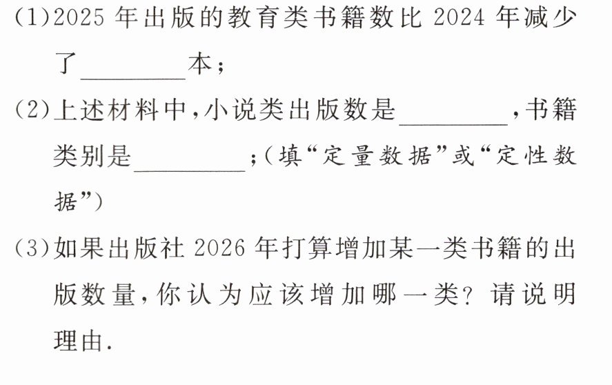 ;(填“定量数据”或“定性数据”)(3)如果出版社2026年打算增加某一类书籍的出版数量,你认为应该增加哪一类?请说明理由.