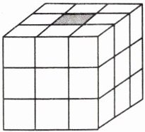 3. [2025·青岛月考]如图,有一棱长为 3 的正方体,将其每个面画上黑线分成 9 个边长相等的小正方形.现在沿阴影标记的小正方形的四边向下打孔,使正方体被打出的这个方孔贯穿,然后将这个被打方孔的正方体浸没在一盆绿水中,于是它被染绿了.接着沿所有的黑线将正方体切开.则仅有两面是绿色的小正方体有