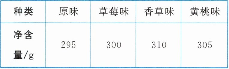 11. 酸奶外包装上标明“净含量:$300\pm 5g$”,随机抽取四种口味的这种酸奶分别称重如下表.其中,净含量不合格的是(