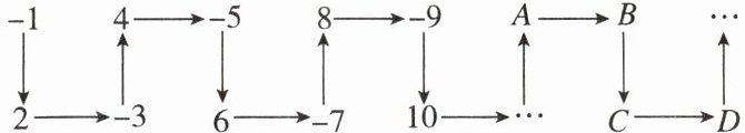 (3)观察可知奇数为负,偶数为正,故第100个数是正数.每4个数看成一组,$100÷4=25$(组),故第100个数排在A的位置.
