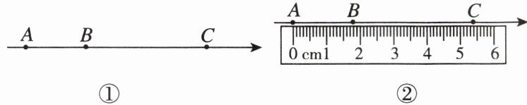 16. 新考向 知识情境化 如图①,点 A,B,C 是数轴上从左到右排列的三个点,表示的数分别为 -5,b,4,某同学将刻度尺如图②放置,使刻度尺上的刻度 0 cm 对齐数轴上的点 A,发现点 B 对齐刻度 1.8 cm,点 C 对齐刻度 5.4 cm,则数轴上点 B 所表示的数 b 为(