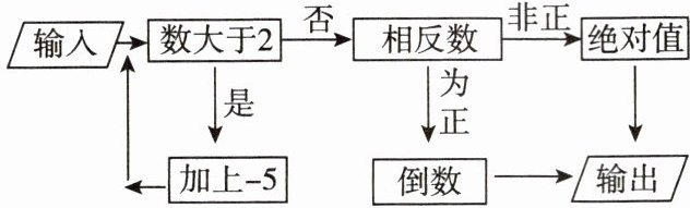 B [点拨]当输入8时,因为8>2,所以8+(−5)=3>2,所以3+(−5)=−2<2,所以−2 的相反数为2>0,所以2的倒数为$\frac{1}{2}$,所以当输入的数是8时,输出的数为$\frac{1}{2}$.