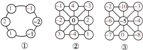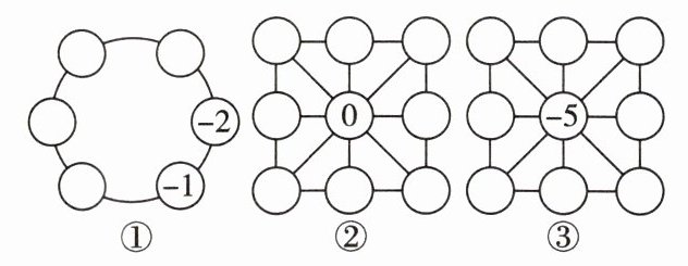 (2) 如图②,在各圆圈内填上适当的数,使每条线上的 $3$ 个数的和为 $0$。