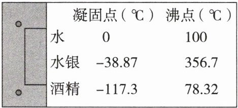 10. 新趋势 跨学科 观察资料卡(如图)中的信息,发现水银的凝固点比酒精的凝固点高(