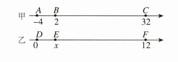 15. (12分)[2024·河北]如图,有甲、乙两条数轴.甲数轴上的三点A,B,C所对应的数依次为-4,2,32,乙数轴上的三点D,E,F所对应的数依次为0,x,12.