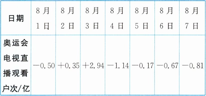 由题知8月1日奥运会电视直播观看户次为2.74−0.5=2.24(亿),8月2日奥运会电视直播观看户次为2.24+0.35=2.59(亿),8月3日奥运会电视直播观看户次为2.59+2.94=5.53(亿),8月4日奥运会电视直播观看户次为5.53−1.14=4.39(亿),8月5日奥运会电视直播观看户次为4.39−0.17=4.22(亿),8月6日奥运会电视直播观看户次为4.22−0.67=3.55(亿),8月7日奥运会电视直播观看户次为3.55−0.81=2.74(亿).2.24+2.59+2.74+3.55+4.22+4.39+5.53=25.26(亿).