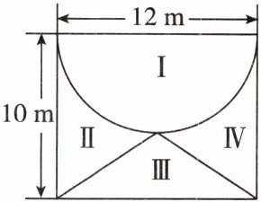 (1)丰收Ⅰ号的面积为$\frac{1}{2}π×(\frac{1}{2}×12)^{2}=18π\approx56(m^{2})$,丰收Ⅲ号的面积为$\frac{1}{2}×12×(10 - 12÷2)=24(m^{2})$,易知丰收Ⅱ号与丰收Ⅳ号的面积一样,所以丰收Ⅱ号的面积为$(10×12 - 18π - 24)÷2\approx20(m^{2}).$