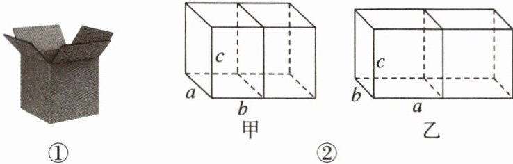 12. [新情境生活应用]某电商平台需要定制一种上盖为双层的长方体外包装纸箱(如图①),上盖纸板面积等于底面面积的2倍,并且每个外包装纸箱刚好能装入两个同样大小的小包装盒(如图②),设装入时不留空隙,且纸箱厚度忽略不计。已知每个小包装盒的长、宽、高分别为$a$,$b$,$c$,且$a = c$,$b < a$。现有如图②所示的甲、乙两种放入纸箱的摆放方式。