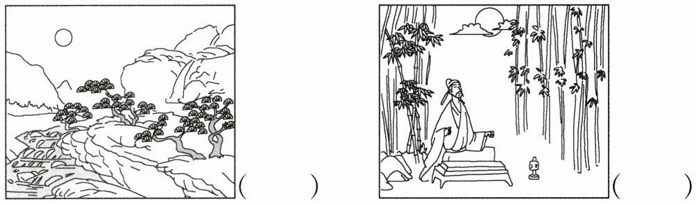 苏轼曾评价王维的诗是“诗中有画,画中有诗”。你能猜出下列图画分别描绘的是王维的哪两句诗吗?选一选。