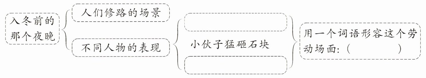 的写法描写劳动场面。请结合语段,在下面思维导图的空白处填写出恰当的内容。张富清用力撬石块 老大爷弓身推石块 齐心协力 既从整体上写出了张富清带领男女老少一齐修路的场面,又通过动作、神态等描写表现出个别人修路时艰难、努力的样子,使场面描写更生动,人物形象更突出。