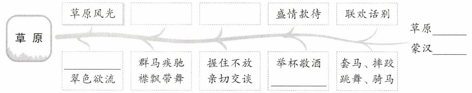 顺序描写了草原的景物。仔细阅读选文,根据提示补全下图。考点4景物:明朗的天空、