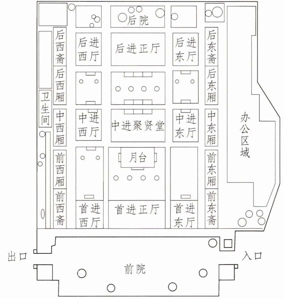 示例:人口→首进正厅→首进西厅→中进西厅→中进聚贤堂→中进东厅→中东厢→后东厢→后东斋→后进东厅→后进正厅→后进西厅→后西斋→后西厢→中西厢→前西厢→前西斋→出口。这样设计可以避免走重复路线,还可以游览更多的景点。