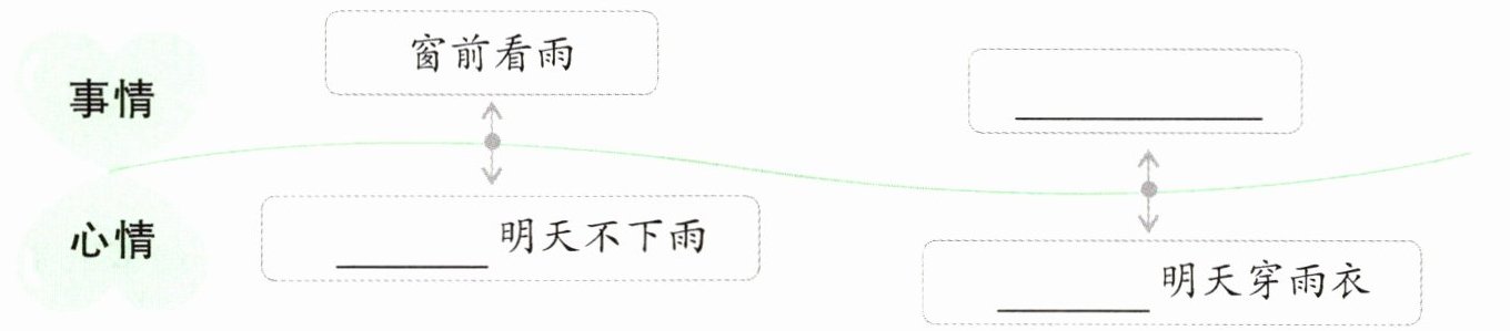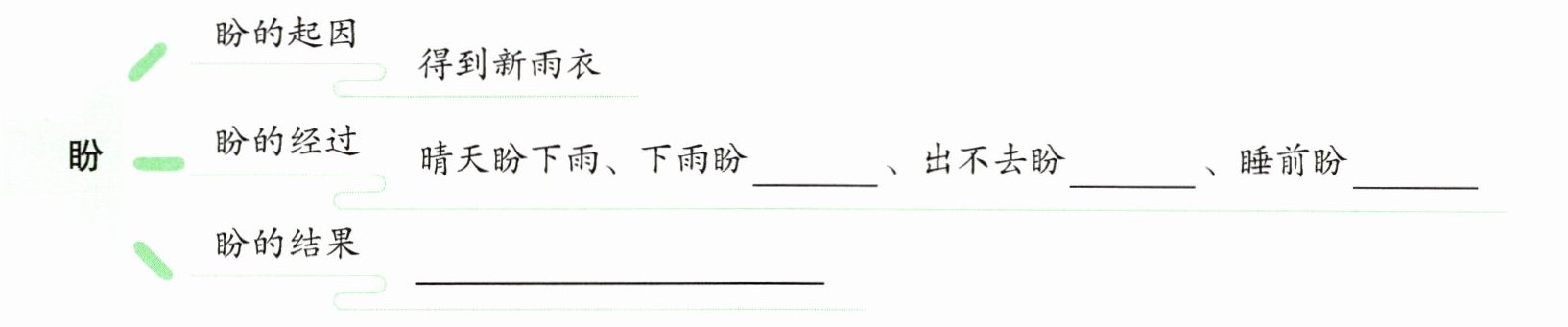 1.担心 推窗赏景 盼望 2.雨敲着鼓点逗引“我”出去 马路上像铺了一层明晃晃的玻璃 小杨树上像挂满了珍珠玛瑙 3.A 4.不矛盾。“我”盼望下雨是因为“我”想穿上新雨衣;但是下雨时“我”又不能出门,不能穿上新雨衣,于是“我”希望雨停下来,留到明天再下,突出表现了“我”对穿上新雨衣的期盼。