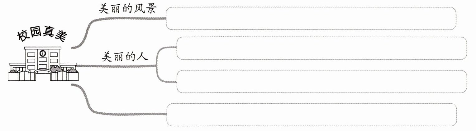 三 状状准备以“校园真美”为题写一篇文章,他可以从哪些方面来选材?具体可以选取哪些事例?请帮他完成下面的思维导图。
