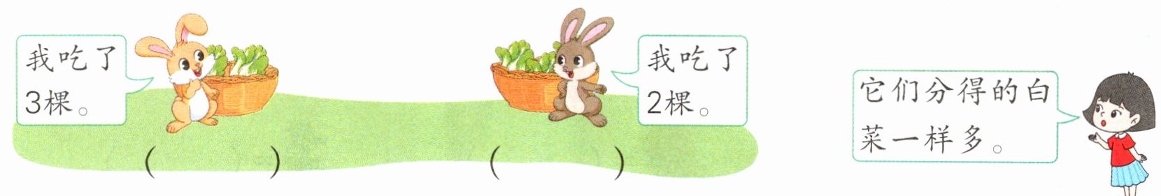 【解析】两只兔子分得的白菜一样多,那么吃得多的兔子剩下的白菜就少,吃得少的兔子剩下的白菜就多。3>2,左边的兔子比右边的兔子吃得多,所以右边的兔子剩下的白菜多。