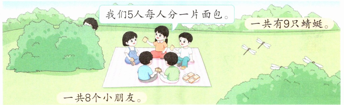 【解析】先读图。一共有8个小朋友,有5人在餐垫上,有几个小朋友躲在草丛后。5人每人分一片面包,剩余4片面包,加法解决的问题:求一共有多少片面包。一共有9只蜻蜓,草丛外有2只,减法解决的问题:求草丛里躲起来了几个小朋友或有几只蜻蜓。