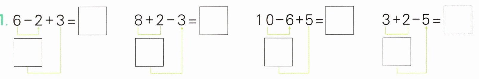 - + + - - + + - - + - + 【解析】可以用尝试法,若算式中等号左侧第一个数不够减第二个数,则填“+”;若不是10以内的加法,则填“-”。
