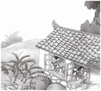 上课了,大家在教室里一起朗读课文,那声音真好听! 这时候,窗外十分安静,树枝不摇了,鸟儿不叫了,蝴蝶停在花朵上,好像都在听同学们读课文。最有趣的是,跑来了两只猴子。这些山林里的朋友,是那样好奇地听着。下课了,大家在大青树下(