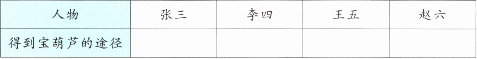 4. 从张三、李四、王五、赵六中任选一个,以第 2 题中表格的内容为基础编一个富有神奇色彩的故事,写一写他是如何在宝葫芦的帮助下一步一步过上好日子的。