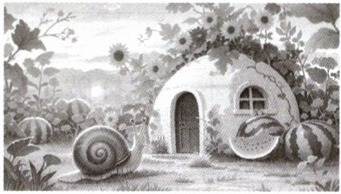 等蜗牛回到家的时候,已经过去了三年。蜗牛大吃一惊:这是我的家吗?门前,长出了绿油油的大西瓜;墙边,开出了金灿灿的向日葵;院子里,一丛一丛的小草,茂密得像一片小草原……可是,这真的是我的家呀!圆圆的房顶,圆圆的窗,圆圆的门,圆圆的墙,就像一个圆圆的蜗牛壳。