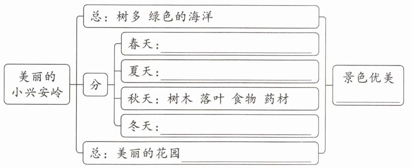 春天:树木 积雪 小溪 小鹿 夏天:树木 浓雾 太阳 野花 冬天:树木 雪花 西北风 动物 总:巨大的宝库 物产丰富