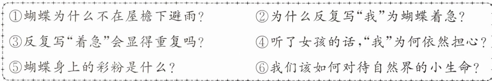 ),我的答案:反复写“我”为蝴蝶着急更能突出“我”担心蝴蝶在雨天受到伤害的心情,也更能表达作者对幼小生命的关爱和对大自然的热爱。